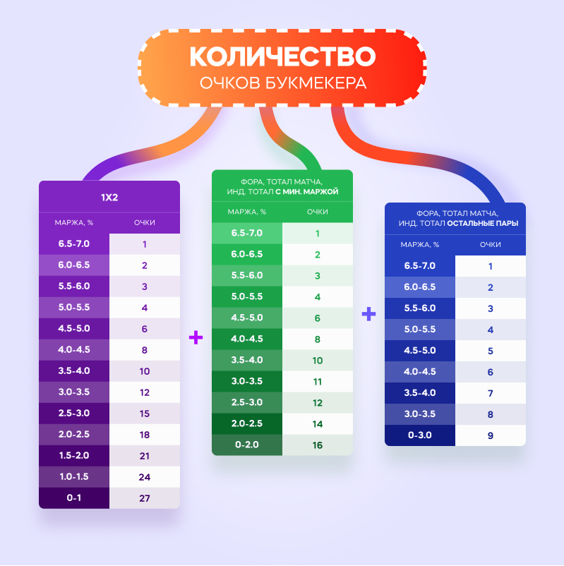 Как видно, чем ниже маржа, тем больше очков начисляется. ?Влияет и популярность рынка, например, 1х2 позволяет заработать большее количество очков, чем остальные рынки.