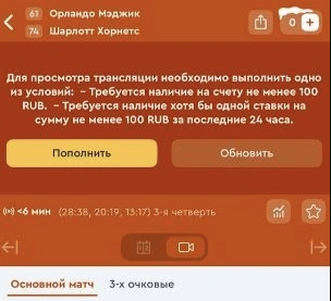 - «Олимпбет» (требуется баланс не менее 100 рублей на счёте или ставка на сумму не менее 100 рублей за последние 24 часа).