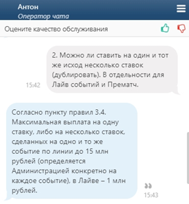 2. На вопрос о повторных ставках получил ответ, что максимальное количество денег на одну позицию – 15 млн. в прематче и 1 млн. – в лайве: