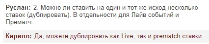 2. Что касается дублирования ставок на одни и те же позиции, то мне предоставили ссылку на правила букмекерской конторы 1хСтавка:
