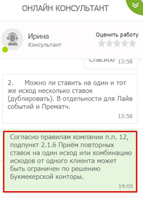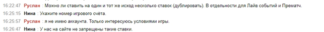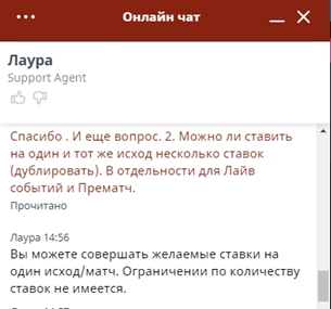 2. Что касается повторных ставок на одни и те же исходы, то и этот вопрос заставил задуматься консультанта Аркадия. После 10 минут его сменил Антон почему-то. Его ответ не убедил, пришлось снова повториться: