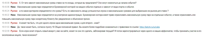4. По поводу лимитов на максимальные ставки хотелось бы услышать точный ответ. Снова оператор Бетсити задумался. Возможно, действительно уточнял детали. Но ответ прозвучал такой же стандартный, как и у предыдущих операторов. Естественно, был задан дополнительный вопрос, на который был дан всё тот же однотипный ответ. Но в качестве бонусного и последнего был задан вопрос о разных максимумах для разных игроков: