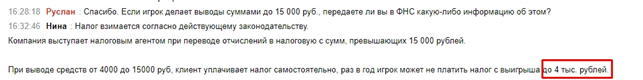 3. Задал вопрос о выводе денег до 15 тыс. рублей. Ответили, что до 14 999 рублей налог при выводе денег не списывается.