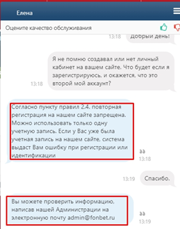 5. Что касается возможной повторной регистрации, то оператор выдал развернутый ответ, что система просто откажет в повторной регистрации человеку. Уточнить все детали можно в администрации, написав на адрес электронной почты Фонбет.