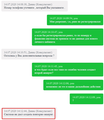 4. Задал вопрос по поводу ошибочного создания второго аккаунта одним человеком. Вначале потребовали указать имя и фамилию. Пришлось задать еще 4 дополнительные вопроса, чтобы получить однозначный ответ о том, что система блокирует повторное создание личного кабинета на одно и то же имя: