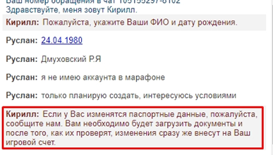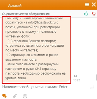 1. На вопрос об изменении паспортных данных спросили место проживания. После ответа и уточнения, что нет аккаунта в БК Лига Ставок снова оператор погрузился в раздумья. Но потом выдал такой развернутый ответ: