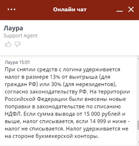 3. По поводу снятий и пополнений оператор 1хСтавка ожидаемо сослался на пункт в правилах о налогообложениях: