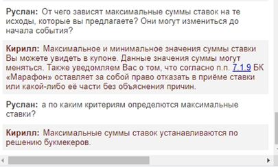 5. Снова пожелал узнать о максимальных ставках и по каким критериям они определяются букмекером Марафон. Оператор поведал ту же историю, типичную для остальных БК. Что всё устанавливается индивидуально и по решению букмекеров (почему-то в множественном числе, возможно ошибся, а может все поступают одинаково).