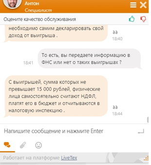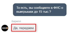 3. Естественно, задал вопрос о налогах с выигрышей до 15 тыс. рублей. И снова ответ получил не сразу, и такой, что потребовалось продублировать вопрос. Ответ получился следующим: