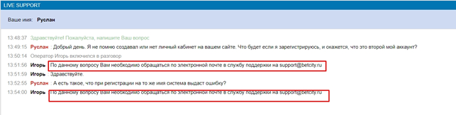 5. На вопрос о повторной регистрации на сайте Бетсити получил ответ, что нужно обращаться в службу поддержки на электронную почту: