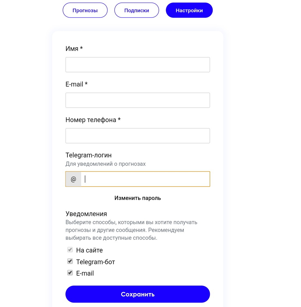 - В Личном кабинете можно подключить рассылку прогнозов через Telegram и e-mail. В первом случае никаких проблем не возникает, прогнозы публикуются одновременно с сайтом. Рассылка по e-mail не работает⚠️;