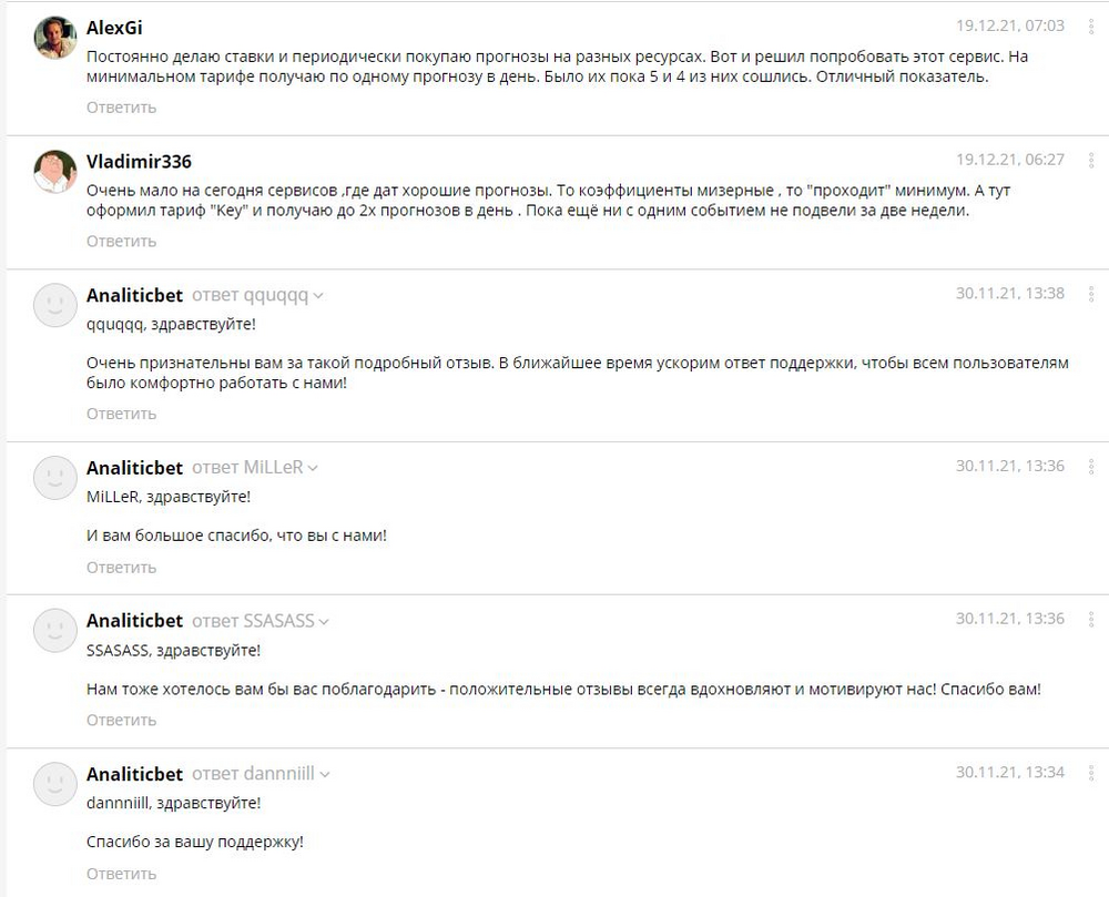 !! UPDATE: В дополнение ко всем вышеописанным недостаткам сервиса можно отнести то, что Analitic Bet занимается публикацией фиктивных отзывов. Судя по наплыву количества «положительных откликов», сервис занимается не улучшением качества продукта, а привлечением клиентов при помощи поддельных отзывов.