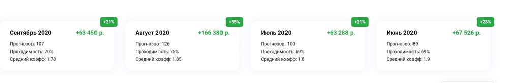 Результаты по прогнозам публикуются лишь за короткий период, поэтому проверить статистику прибыльности проблематично. На сайте указана небольшая сводка за несколько месяцев – средний коэффициент, количество прогнозов, процент проходимости и прибыль.