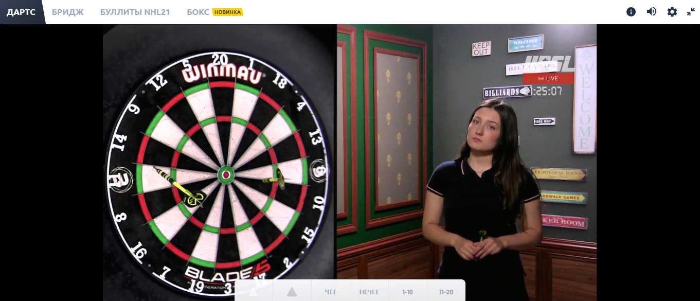 В Дартсе участвует два игрока (дилера), поединок состоит из 10 раундов по 3 броска для каждого. Побеждает игрок, который по итогам всех раундов смог набрать большее количество очков. Делать ставки можно на каждый бросок.