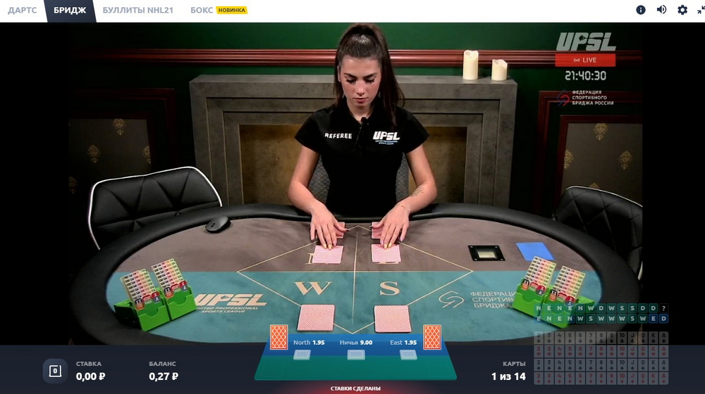 Данная игра проводится по правилам спортивного бриджа. Игроку предлагается угадать, кому из участников выпадет карта старше, сделав ставку на один из четырёх секторов стола. Предусмотрено малое количество исходов – можно поставить лишь на сектор с картами, а также на возможную ничью. На ничейный исход предлагается самый высокий коэффициент 9, для остальных событий он равен 1,95. Котировки фиксированные.