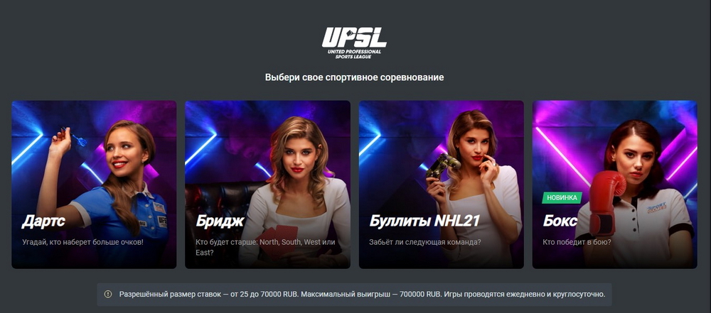 Букмекерская контора «Леон» (ЦУПИС) представила новый раздел для игроков – «Ставки 24/7». В нём доступно 4 спортивных соревнования для заключения пари, они организованы Объединённой Профессиональной Спортивной Лигой (upsl.ru). А все игры проводятся в режиме онлайн, в круглосуточном режиме.