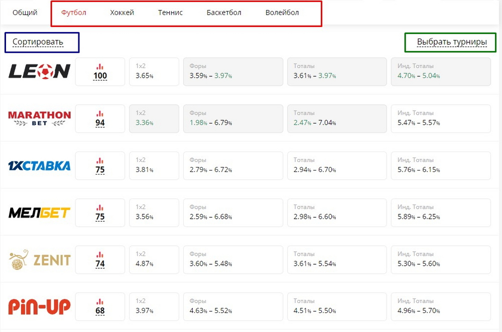 Не ленитесь, уделите несколько минут и подберите оптимальный вариант. Если лень взяла своё, подскажем про общие тенденции по футболу, хоккею, теннису и баскетболу. По данным видам спорта в тройке сильнейших всегда есть только Марафон. БК 1хСтавка и Леон не попали в тройку лишь однажды. И самое главное наблюдение — в каждом виде спорта есть свой лидер. Это лишний раз доказывает, что контору нужно искать под собственные вкусы и предпочтения.