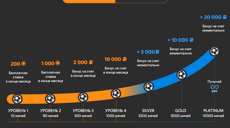 Самой поздней ступенькой является статус VIP-Platinum. За его достижение начисляется 20 000 рублей, при этом нужно собрать 10 000 «мячей» (сделать ставок на 10 млн рублей). Эта же сумма будет начисляться за каждые 10 000 «мячей».