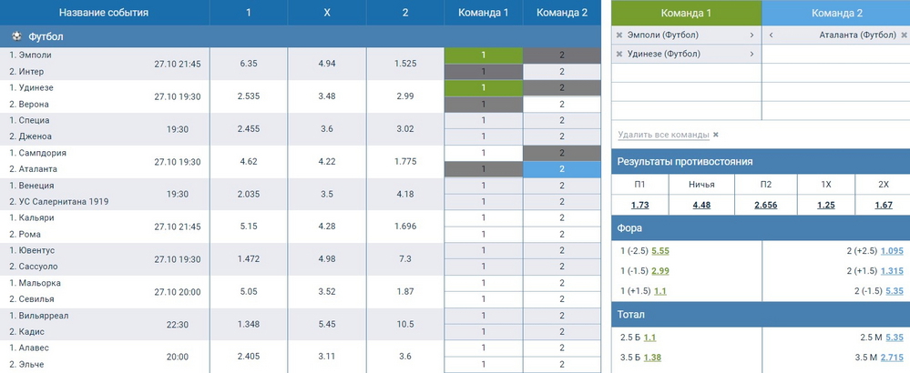 Я добавил «Эмполи» и «Удинезе» в Команду 1, а «Аталанту» в Команду 2. Справа мне предлагают коэффициенты на различные исходы. Для того, чтобы сыграла ставка П1, нужно, чтобы «Эмполи» и «Удинезе» в сумме забили больше, чем «Аталанта». Аналогичным образом работают форы, тоталы и другие типы ставок.