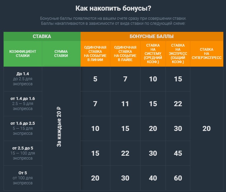 Бонусная программа Балтбет разнообразнее, но более запутанная, система набора баллов не самая простая. Она зависит от коэффициента и типа ставки (ординар или экспресс). Одно понятно без дополнительных объяснений — определенное количество баллов мы получаем за каждые 20 рублей ставки.