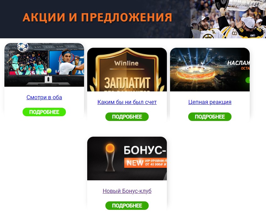 Для примера, заглянем на то, что предлагает БК Винлайн. На трансляциях спортивных матчей они постоянно презентуют свои новые предложения, как будто это что-то эксклюзивное и сверхинтересное. Но по факту страница «Акции и предложения» не меняется уже почти целый год.