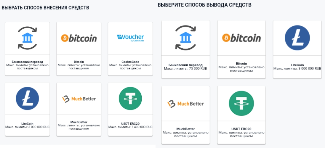 Среди способов пополнения для клиентов из РФ – банковские карты (в том числе системы МИР, перевод через СБП и SberPay), электронные кошельки (для игроков из РФ предусмотрены кошельки MoneyGo и Piastrix), банковский перевод, а также множество видов криптовалют и электронный ваучер. Аналогичные варианты предлагаются для вывода средств.