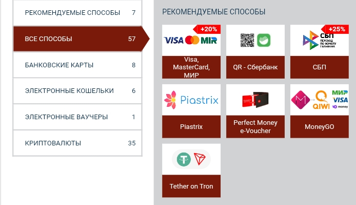 Для счета в рублях доступно множество способов пополнения и вывода средств с использование РФ карт (включая МИР), отдельные методы заведены для Сбербанка и Т-банка (Тинькофф). Большой выбор криптовалют.