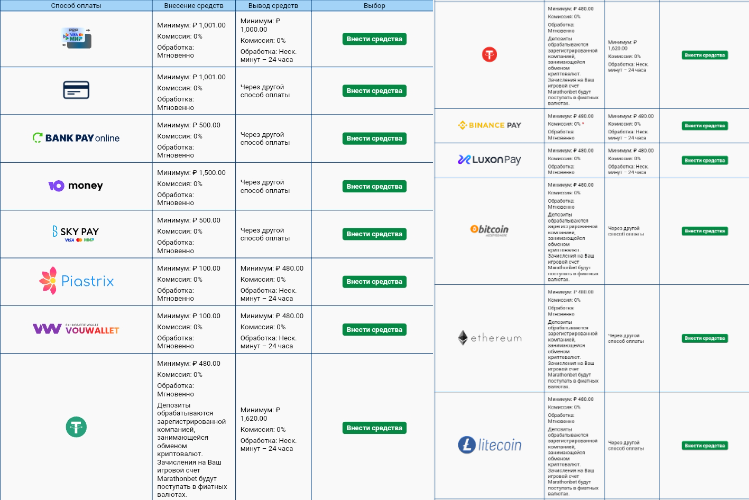 Пополнить счёт в Marathonbet российским игрокам можно с помощью банковских карт (в том числе МИР), электронных кошельков ЮМани и Piastrix и ряда криптовалют. Для вывода доступно меньше вариантов, но их всё равно достаточно.