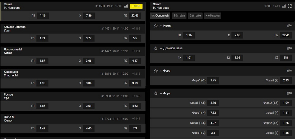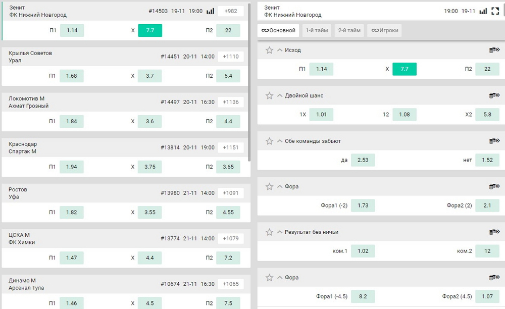 Есть сходства и в росписи, рассмотрим на примере РПЛ и матча «Зенит» — «Нижний Новгород»: