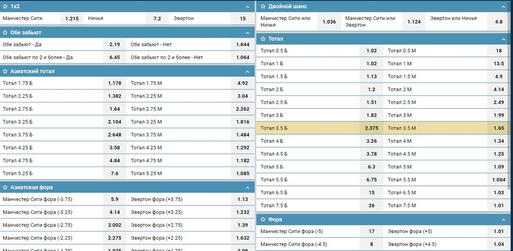Линия и роспись здесь идентичные, а вот внешнее оформление росписи уже разное. У кого удобнее — вопрос спорный. Для наглядности, вот так выглядит роспись к матчу «Манчестер Сити» — «Эвертон»: