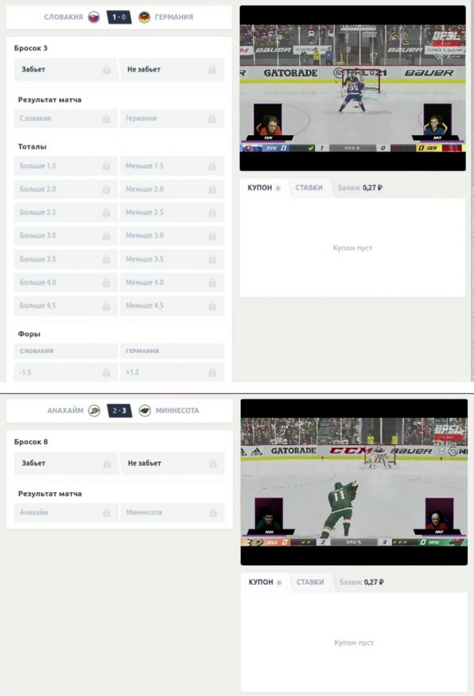 Буллиты. Матчи в «Буллитах» основываются на результатах видеоигры NHL21, они проходят между двумя кибеспортсменами. Игроку предлагается заключать пари на победителя, тоталы буллитов, форы, сможет ли забросить соперник.
