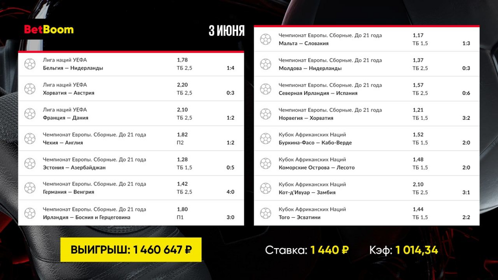 Букмекерская контора BetBoom выплатила своему игроку крупный выигрыш по экспрессу из 15 событий. Пользователь конторы поставил 1 440 рублей на ряд футбольных событий с коэффициентами от 1,17 до 2,20 и общим коэффициентом 1 014,34. Когда каждая ставка в экспрессе сыграла, беттор получил выплату в размере 1 460 647 рублей.