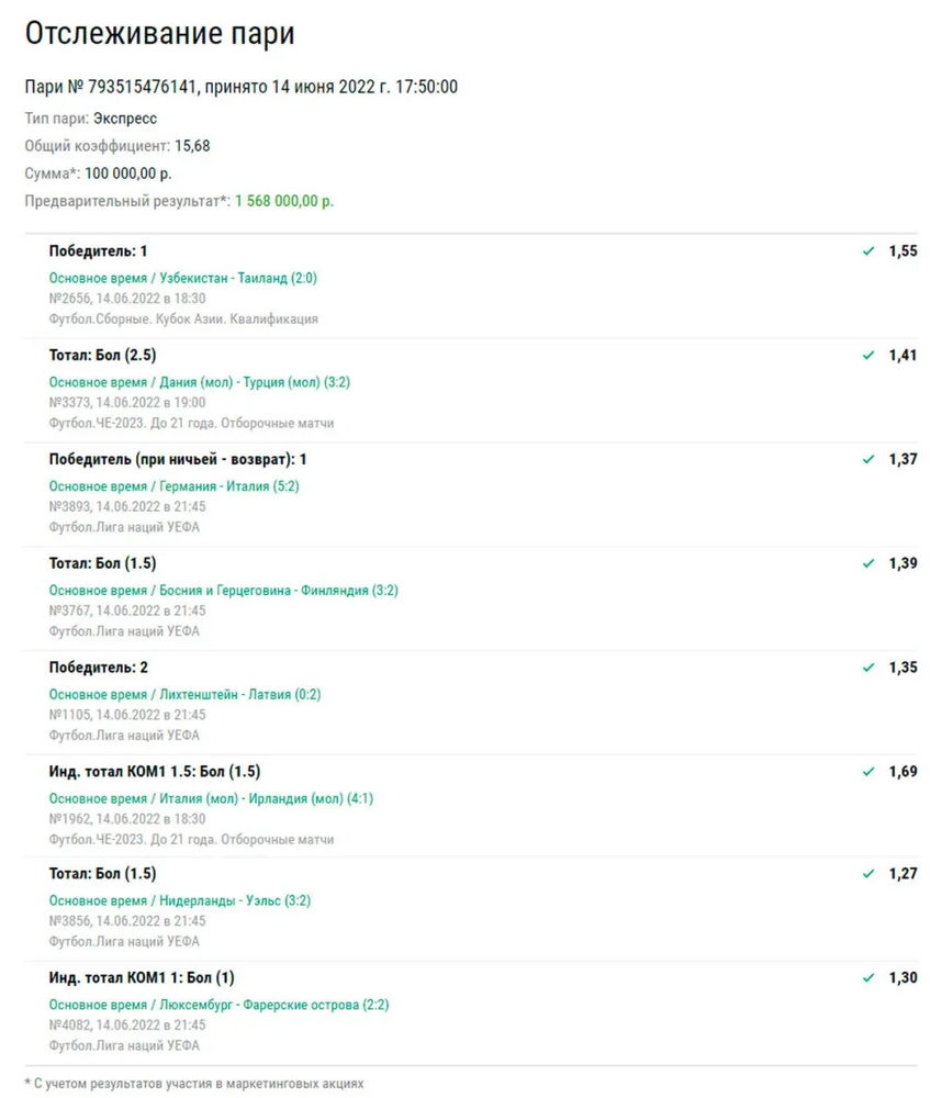 После того, как экспресс сыграл, клиент «Лиги Ставок» получил выплату в размере 1 568 000 рублей.