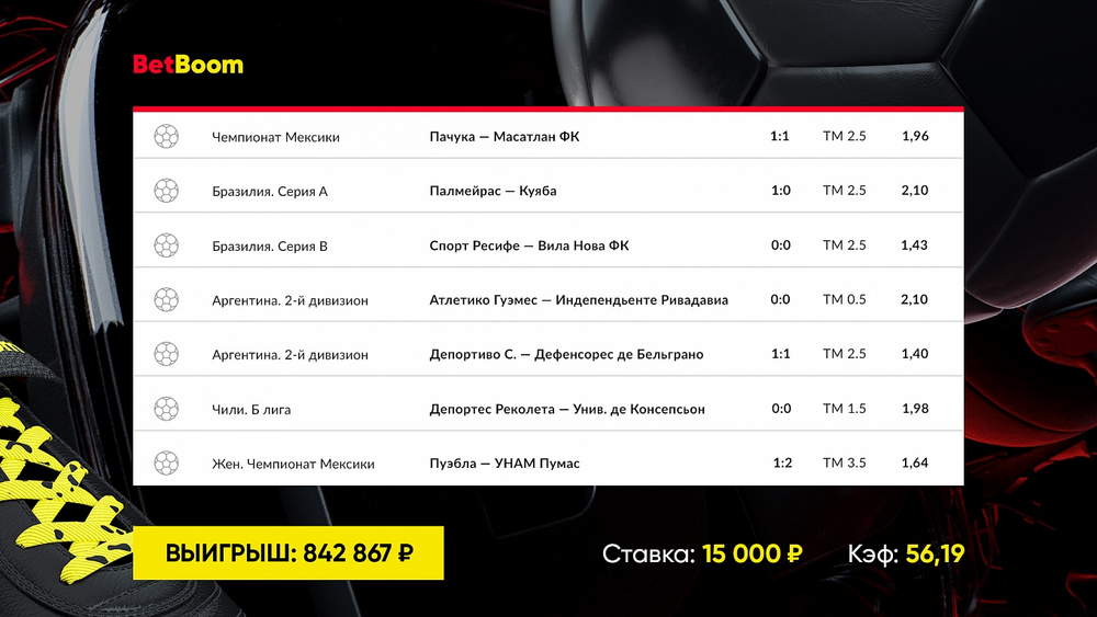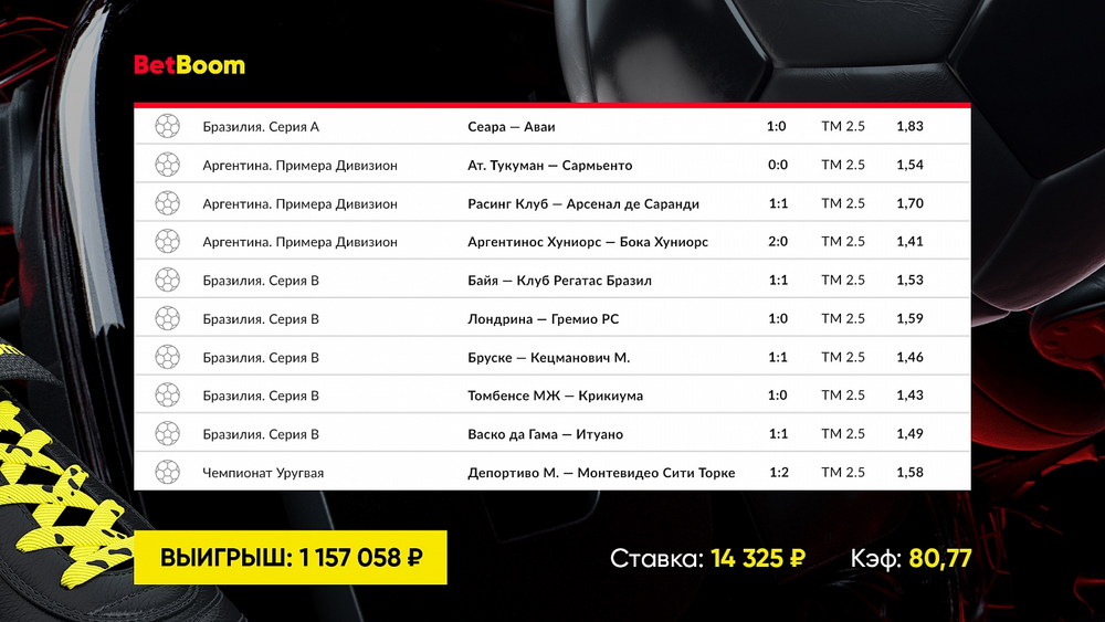 В выигрышные купоны вошли матчи чемпионатов Центральной и Южной Америки. Общий коэффициент одного экспресса составил 56,19 и принес игроку 842 867 рублей. Во втором экспрессе итоговый коэффициент составил уже 80,77, а выигрыш превысил миллионную отметку – 1 157 058 рублей.