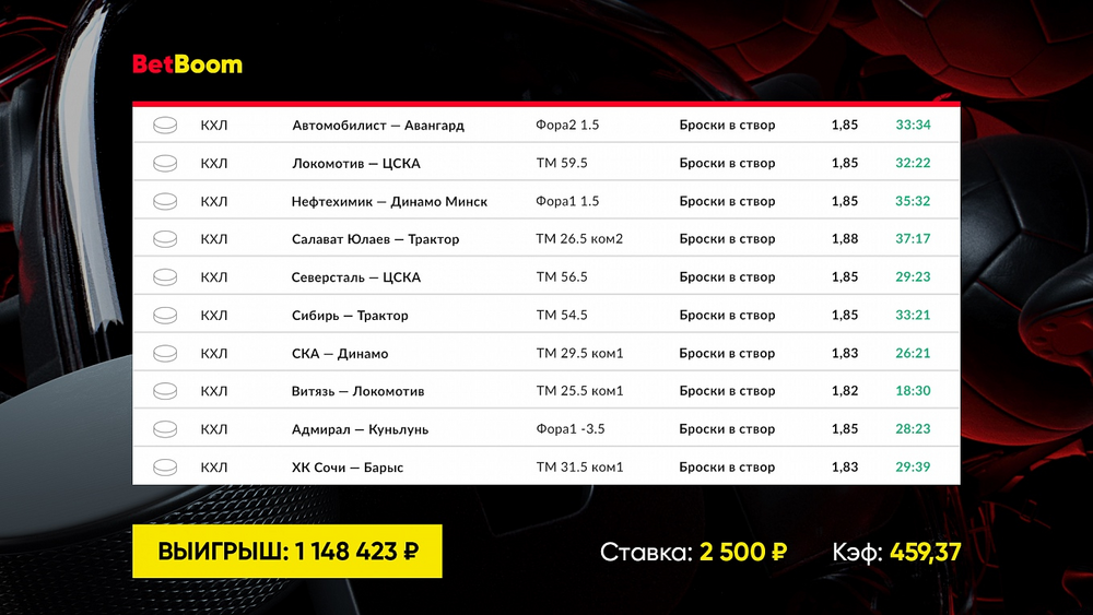Игрок букмекерской конторы BetBoom собрал оригинальный экспресс из десяти хоккейных матчей. Для ставки беттор выбрал игры КХЛ и в каждой из них поставил на броски в створ ворот. Клиент конторы верно определил тоталы и форы в каждом из событий и заработал 1 148 423 рубля на ставке в 2 500.