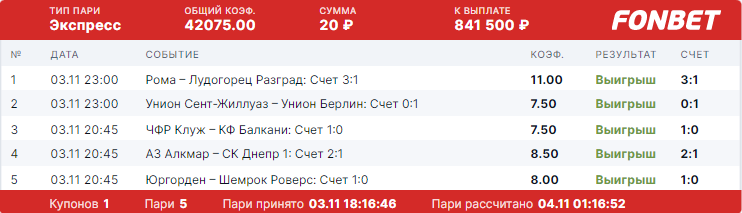 Клиент букмекерской конторы «Фонбет» собрал экспресс с коэффициентом 42 075,00 и верно определил каждый исход в нем. Игрок решил не рисковать многим и сделал мизерную ставку в 20 рублей. В свой купон он включил пять футбольных матчей, проходивших в рамках Лиги Европы и Лиги конференций 3 ноября.