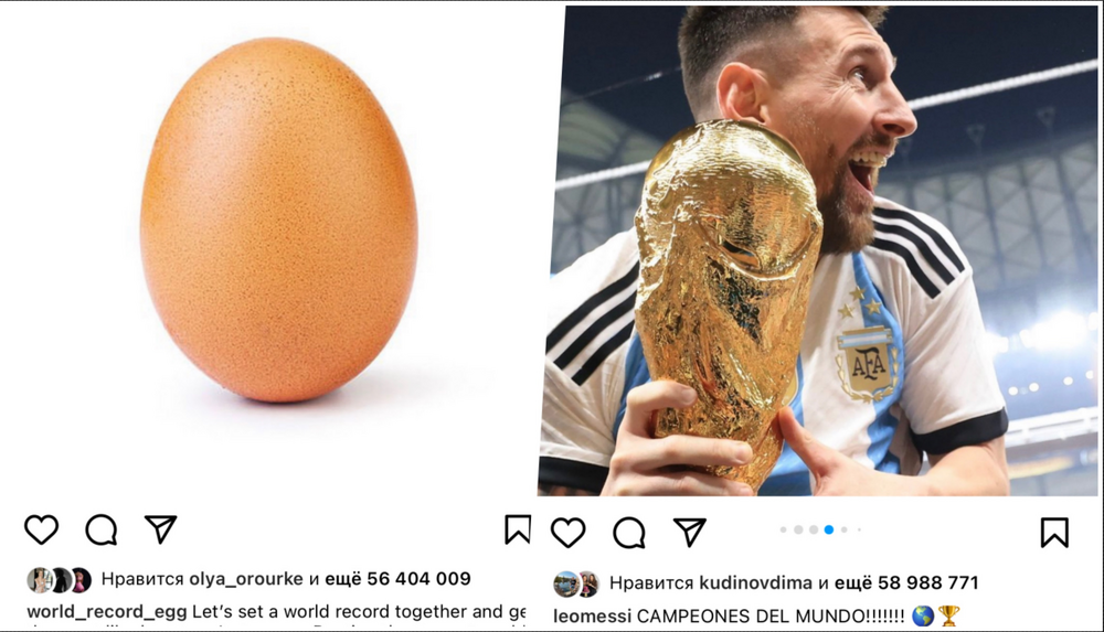 Лео Месси и Кубок мира по футболу сместили с вершины нашумевшее почти 4 года назад куриное яйцо, которое собрало более 56 миллионов лайков. При этом яйцо было опубликовано специально для того, чтобы установить новую планку по количеству лайков и обогнать показатель в 18 миллионов, установленный американской моделью Кайли Дженнер.