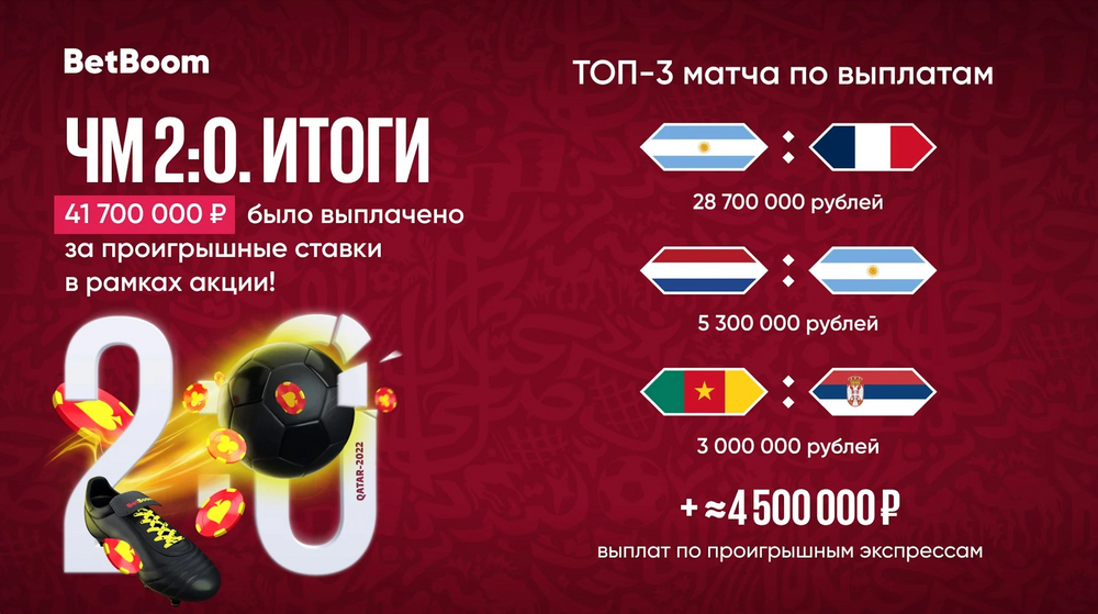 На время проведения чемпионата мира по футболу букмекерская контора BetBoom запустила акцию «ЧМ 2:0». По условиям промо, игроки получали досрочные выплаты на исход, если команда ведет в счете в два мяча.