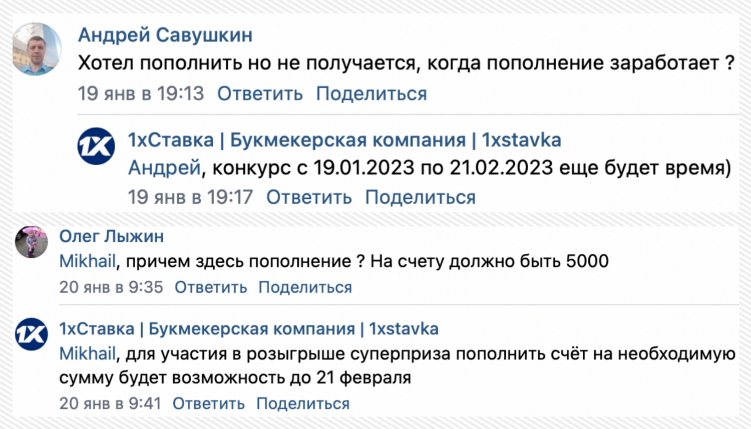 Это довольно странно, ведь выполнить это условие невозможно с вечера 16 января. На вопросы подписчиков нашлись интересные ответы представителей «1хСтавки»: