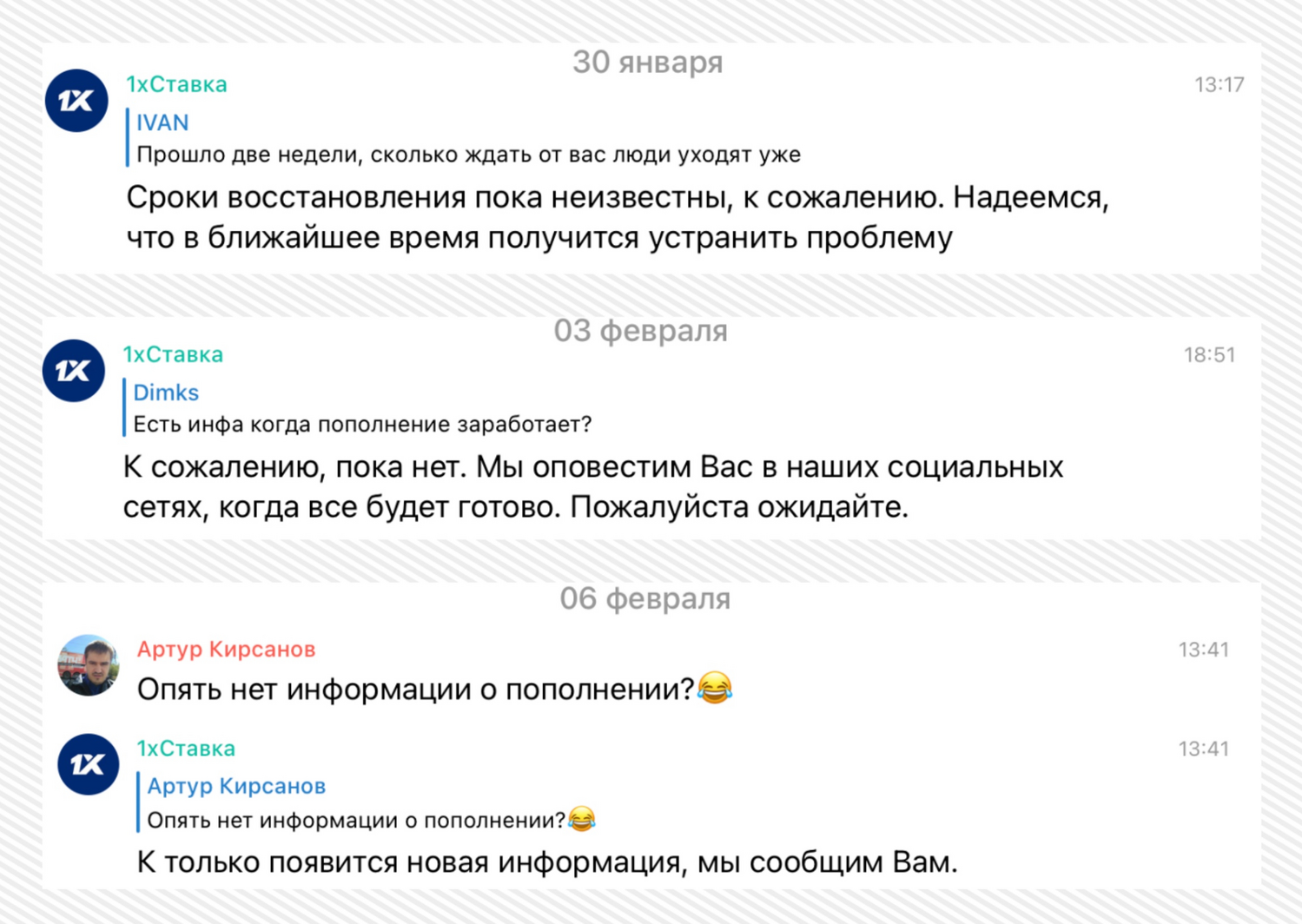 На вопросы клиентов конторы сотрудники не дают конкретной информации. Неизвестны ни причины, ни сроки устранения неполадок. В Telegram-канале, группе ВК и в службе поддержки все это время даются однотипные ответы: