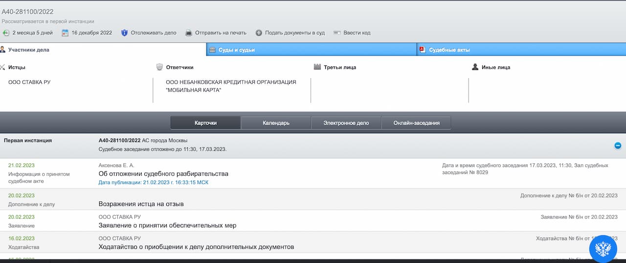 Сегодня, 21 февраля, в Арбитражном суде Москвы состоялось второе заседание по иску БК «1хСтавка» к ЕЦУПИСу, в котором букмекер требует признать незаконным отказ от проведения операции от 29 ноября 2022 года.