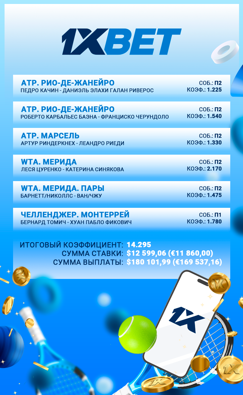 Клиент букмекерской компании 1xBet выиграл 180 101,99 долларов благодаря экспрессу из шести теннисных матчей. В своем купоне игрок правильно спрогнозировал победителей в играх, проходивших в рамках АТР в Рио-де-Жанейро, АТР в Марселе, WTA в Мериде и Челленджера в Монтеррее.