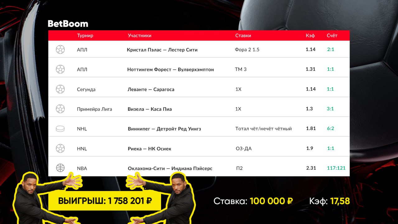 При ставке в 100 000 рублей игрок BetBoom смог на одном экспрессе получить выигрыш в размере 1 758 201 рубль.