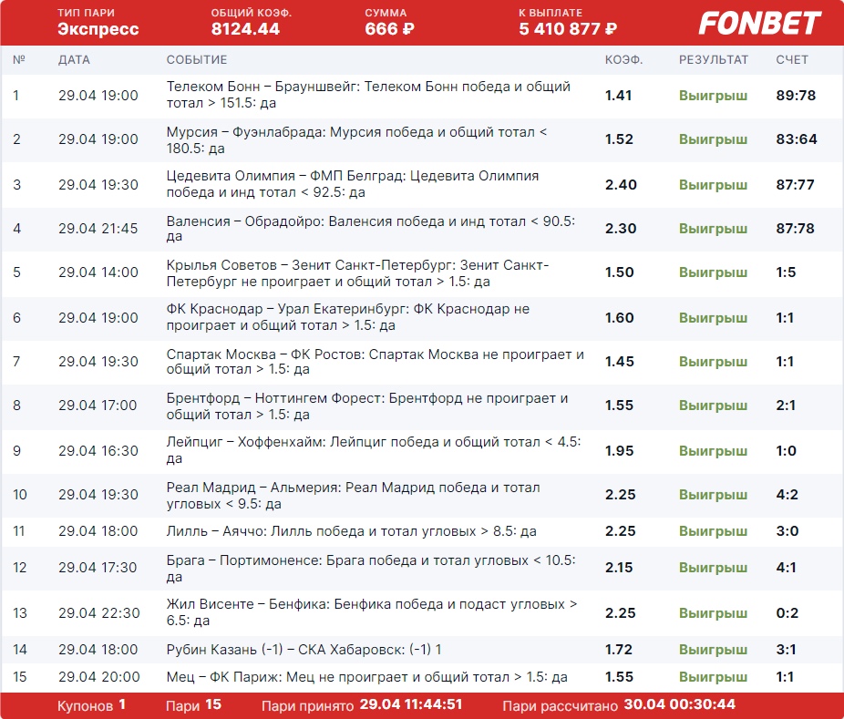Игрок букмекерской конторы «Фонбет» собрал экспресс из 15 совершенно разносторонних событий и поставил на него 666 рублей. В купон беттора вошли футбольные и баскетбольные матчи, проходившие 29 апреля в различных лигах мира.