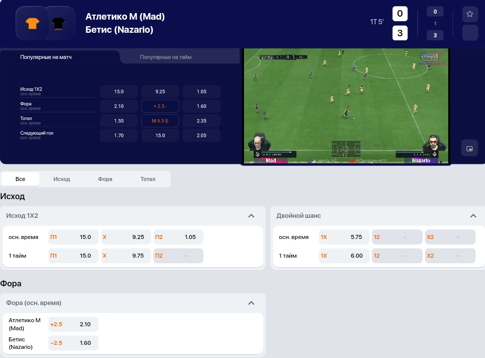 - Отсутствие дополнительных вариантов пари. Для футбольного симулятора недоступны ставки на статистические исходы, а долгосрочные рынки предлагаются лишь для крупных матчей крупных турниров;