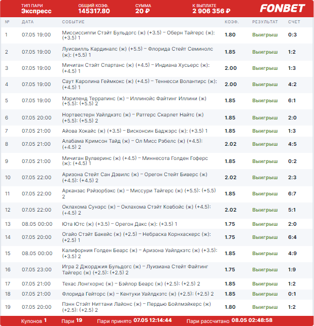 Клиенту букмекерской конторы «Фонбет» удалось собрать выигрышный экспресс из 19 событий, которые проходили в ночь с 7 на 8 мая. Все 19 ставок в купоне были сделаны на исход с учетом форы в матчах по женскому софтболу. Житель Самары проявил потрясающее знание в не самом популярном виде спорте, но здесь явно не обошлось без доли везения.