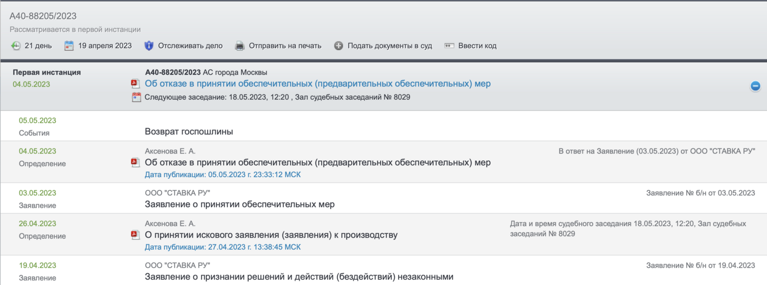 По регламенту суд действительно мог удовлетворить запрос компании, если бы посчитал, что это поможет избежать затруднений в рассмотрении дела или нанесения значительного ущерба заявителю. Поскольку ООО «Ставка Ру» не удалось предоставить суду достаточные доказательства необходимости переподключения к ЕРАИ, прошение от 3 мая было отклонено. Следующее слушание по данному делу запланировано на 18 мая.