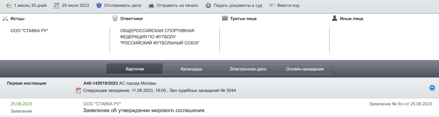 Букмекерская компания «1xСтавка» больше не имеет финансовых требований к Российскому футбольному союзу (РФС), согласно арбитражным записям, где упоминается о заключении мирового соглашения.