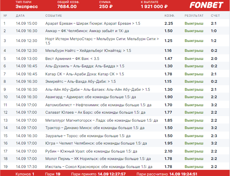 Сегодня, 19 сентября, стало известно о том, что пользователю букмекерской конторы «Фонбет» удалось выиграть 1 921 000 рублей, собрав экспресс из 19 событий.