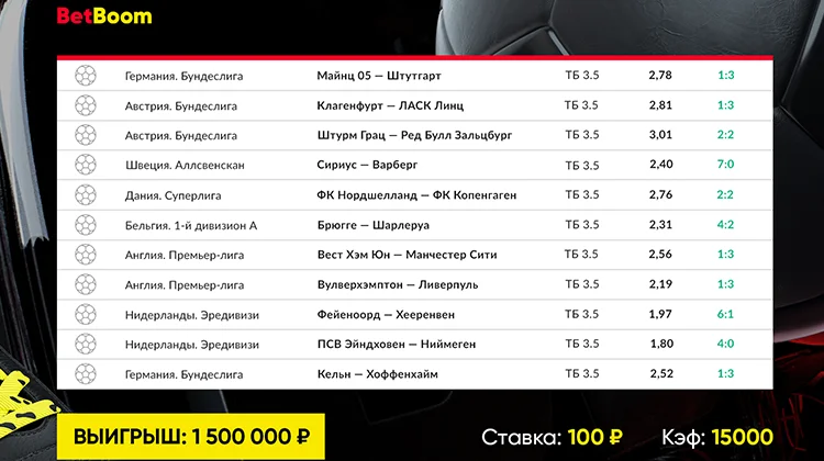 Клиент букмекерской конторы Betboom выиграл 1 500 000 рублей, собрав экспресс из 11 событий с максимально возможным коэффициентом – 15 000.
